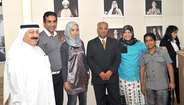 - من اليمين: نزار المحروس، صفاء عباس أم نزار، أبو نزار، فاطمة الحلواجي أستاذة اللغة الانجليزية في جامعة البحرين ومترجمة كتاب: المحرق وردة البحر، زوجها حسين المدني، حسين علي نائب رئيس جامعة دلمون‬