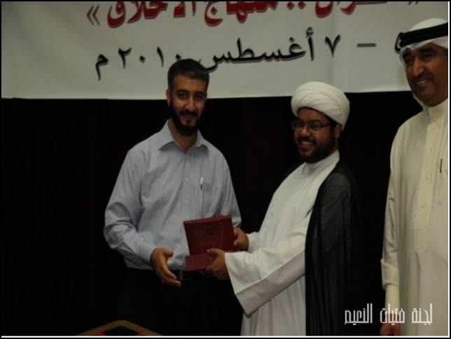 تقدم كل من الأستاذ غازي عبد المحسن " رئيس مركز شباب النعيم " ,الأخت نعيمة مهنا " رئيسة لجنة الفتيات", السيد محمد هادي الغريفي , الشيخ جاسم المؤمن و عدد من أعضاء و إدارة مركز شباب النعيم مصاحبين الأستاذ الأستاذ حسين المديفع ممثل مجموعة الطشاني القابضة لقص شريط المعرض و التنقل بين زواياه المختلفة و المميزة.