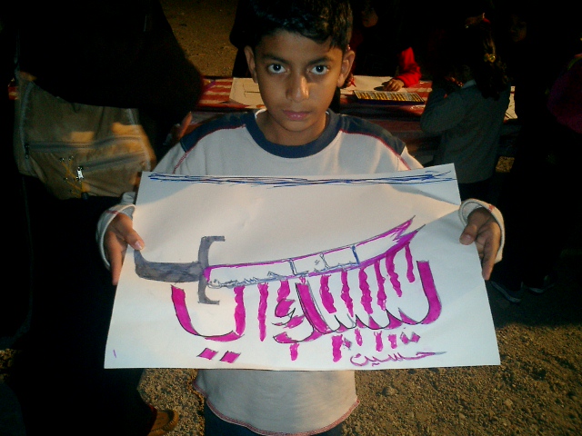 وفي أحدى اللوحات التي لفتت انتباهي لعمار رضي الحواج (9 سنوات) أنه رسم صورة طبق الأصل للمجسم الخارجي للإمام الحسين والذي صممه رئيس لجنة الخدمات سيد سعيد الحلاي .