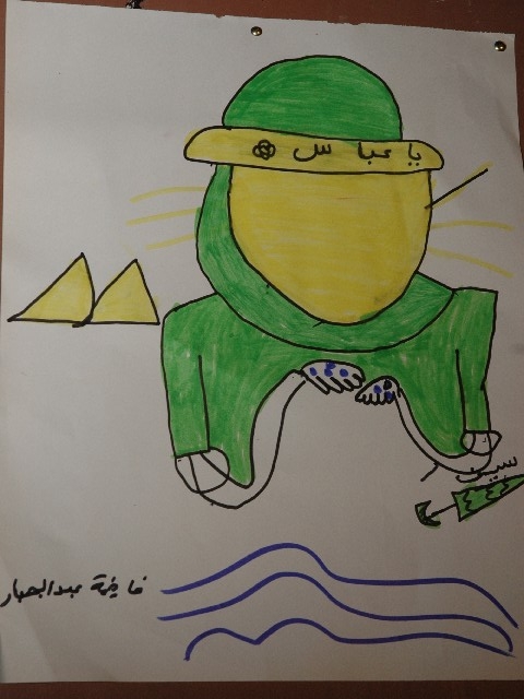 فاطمة عبدالجبار الوداعي (8 سنوات) بمدرسة سمية الابتدائية للبنات فقد رسمت الإمام العباس (ع) وهو عطشان ويريد شرب الماء , إلا أنه آثر على نفسه وملء القربة لأخيه الحسين (ع) , وتقول أنها فرحت كثيرا بالفعالية لأن الناس كلها مجتمعه ورسومات الأطفال معلقه .